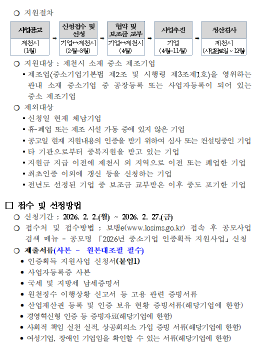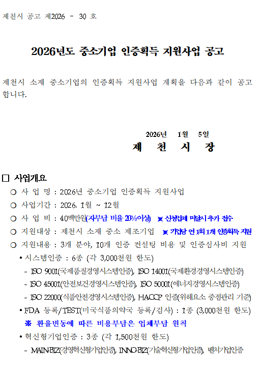 [한국경영연구소] [충북] 제천시 2026년 중소기업 인증획득 지원사업 공고