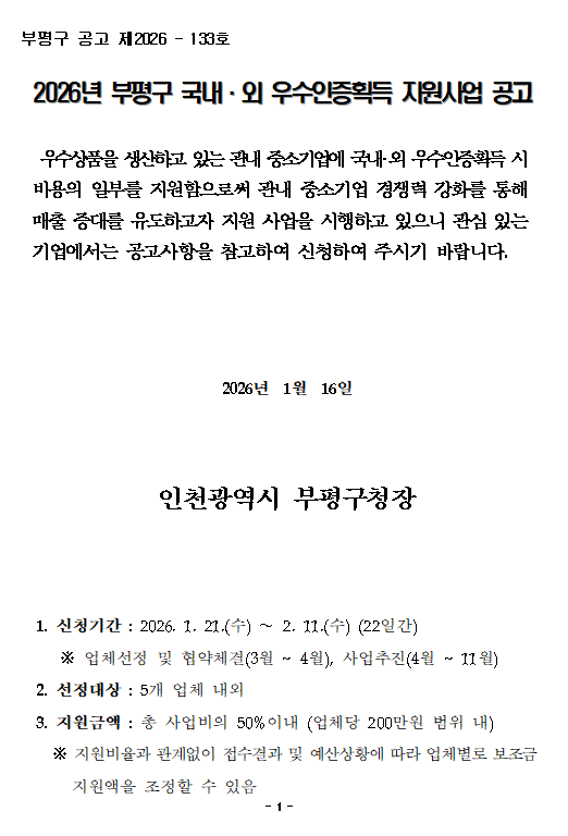 [한국경영연구소] [인천] 부평구 2026년 국내ㆍ외 우수인증획득 지원사업 공고