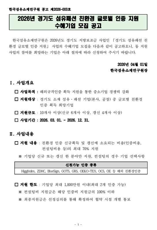 [한국경영연구소] [경기] 2026년 섬유패션 친환경 글로벌 인증 지원 수혜기업 모집 공고