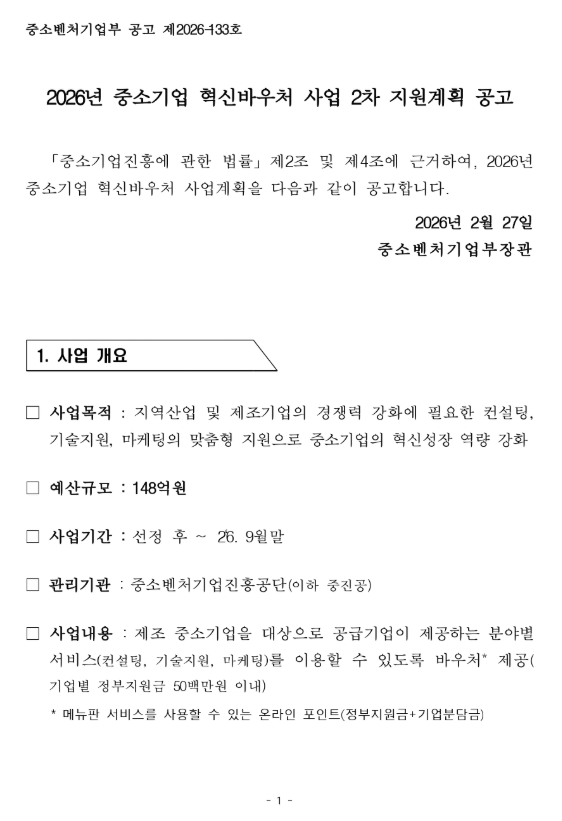 [한국경영연구소] 2026년 2차 중소기업 혁신바우처 사업 지원계획 공고