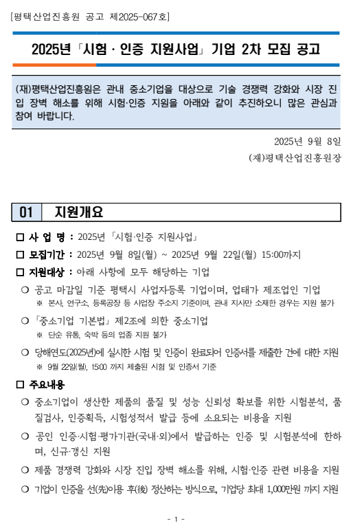 [한국경영연구소] [경기] 평택시 2025년 2차 시험ㆍ인증 지원사업 지원기업 모집 공고