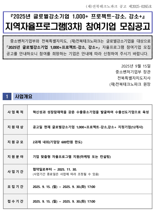 [전북] 2025년 3차 글로벌 강소기업 1,000+ 프로젝트-강소ㆍ강소+ 지역