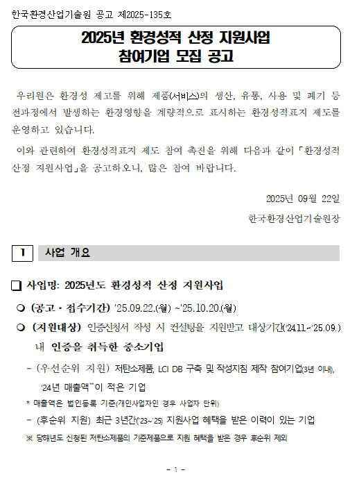 [한국경영연구소] 2025년 환경성적 산정 지원사업 참여기업 모집 공고