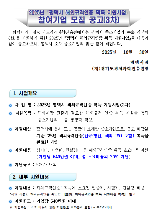 [한국경영연구소] [경기] 평택시 2025년 3차 해외규격인증 획득 지원사업 참여기업 모집 공고