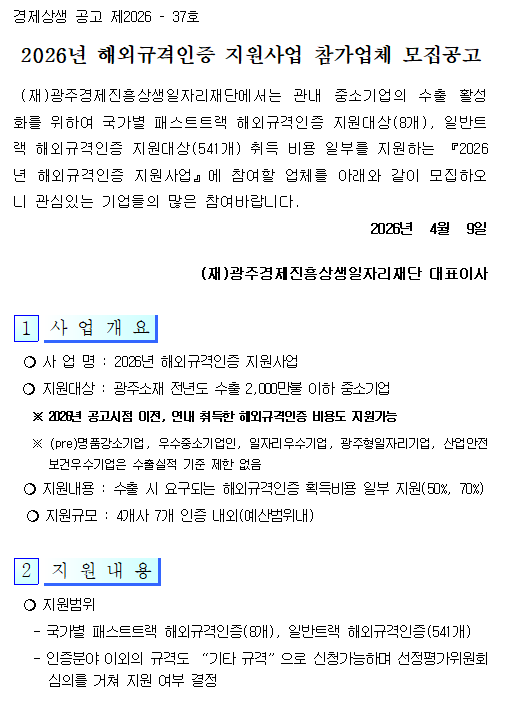 [한국경영연구소] [광주] 2026년 해외규격인증 지원사업 참가업체 모집 공고
