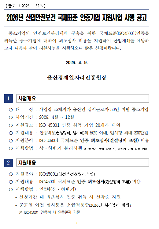 [한국경영연구소] [울산] 2026년 상반기 산업안전보건 국제표준 인증기업 지원사업 시행 공고