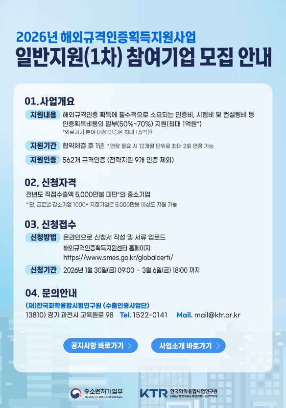 [한국경영연구소] 2026년 해외규격인증획득지원사업 일반지원 참여기업 모집안내