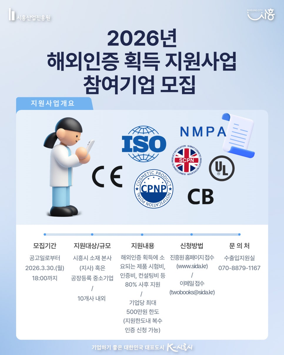 [한국경영연구소] [경기] 시흥시 2026년 해외인증 획득 지원사업 참여기업 모집 공고